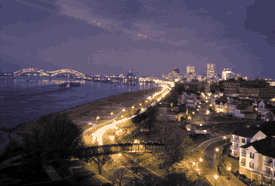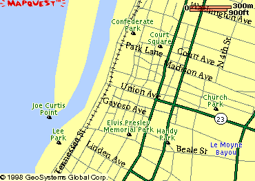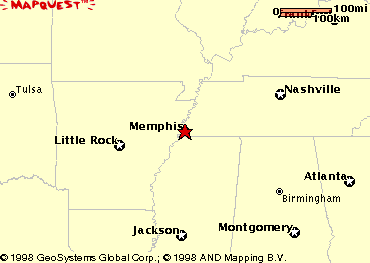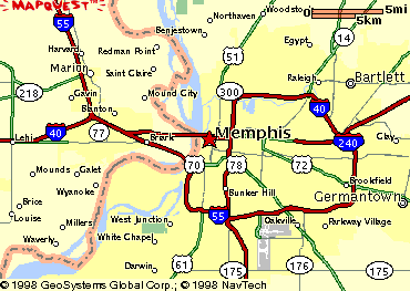 Memphis proper has more than 500,000 residents; the metropolitan Memphis area, about 1,000,000. Here are a few maps of Memphis at differing scales (from Map Quest). I apologize that all of them suck in the sense that they hardly refer to specific event sites. I don't know how to drive map software worth a darn. If anyone can do better or has suggestions for a better way of displaying what ought to be displayed, please contact me at defunct mail address.